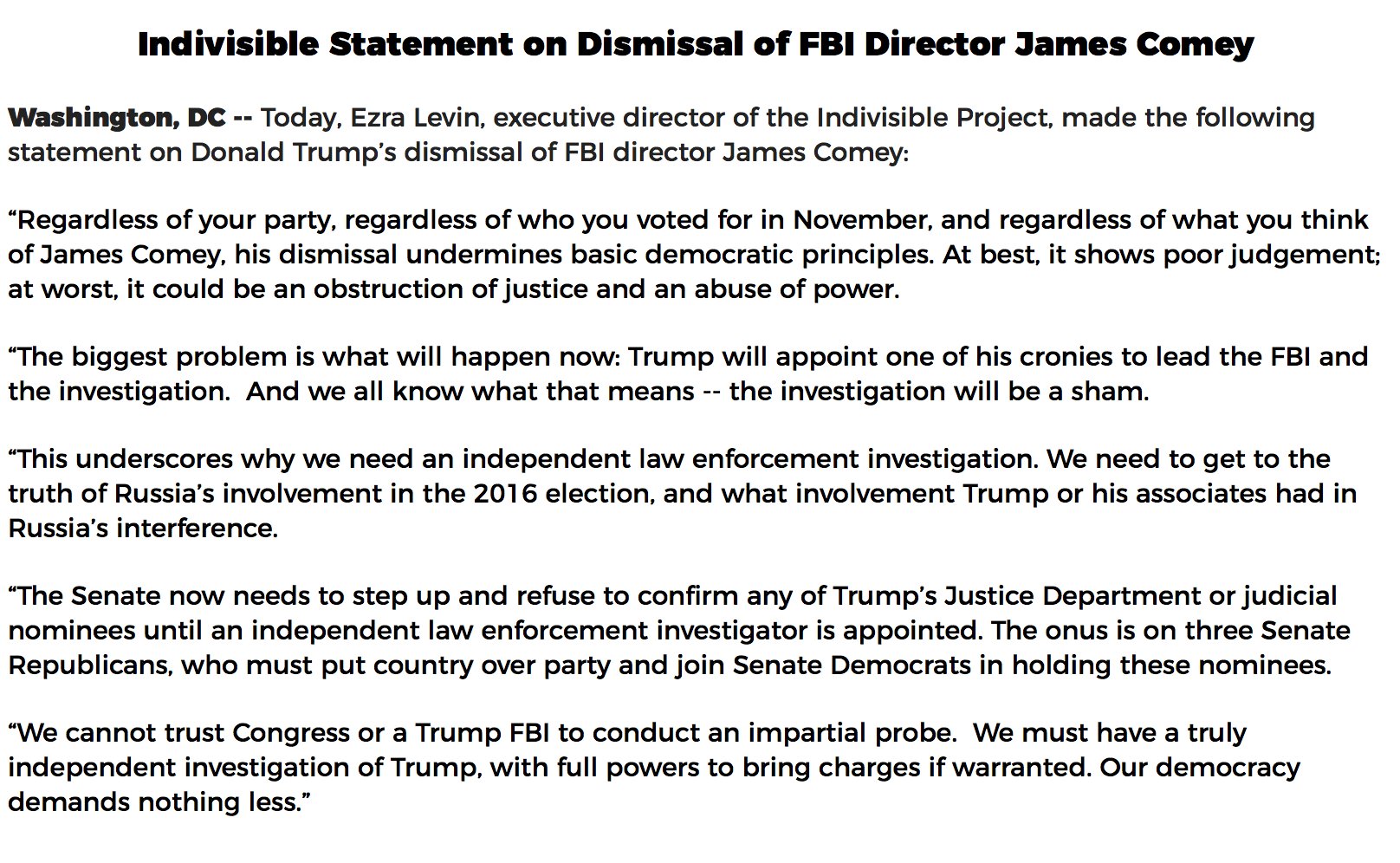 Indivisible's Statement on the Firing of FBI Director James Comey